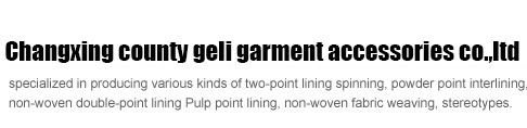 The company is specialized in producing all kinds of interlining production enterprises with spinning double-point lining, powder-point lining, non-woven double-point lining, pulp lining, non-woven fabrics with weaving, setting and lining coating. The main products are spinning interlining and non-woven interlining. |